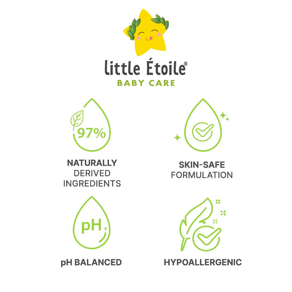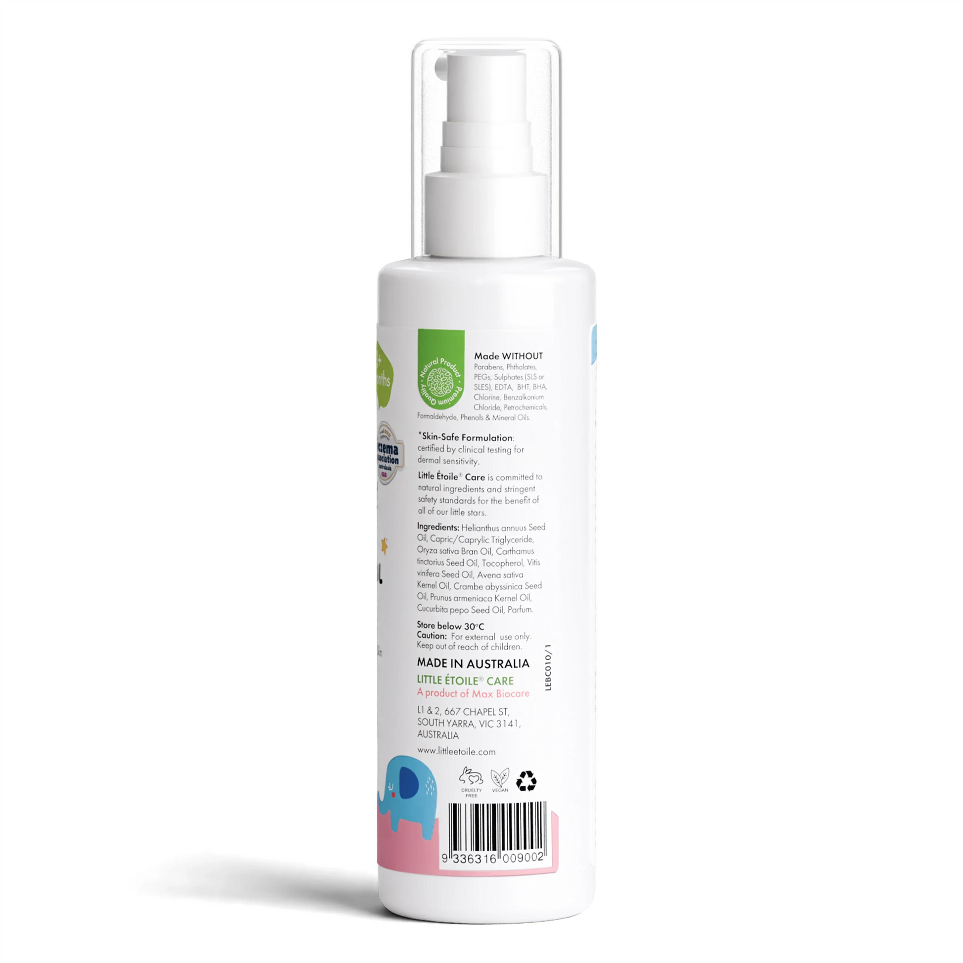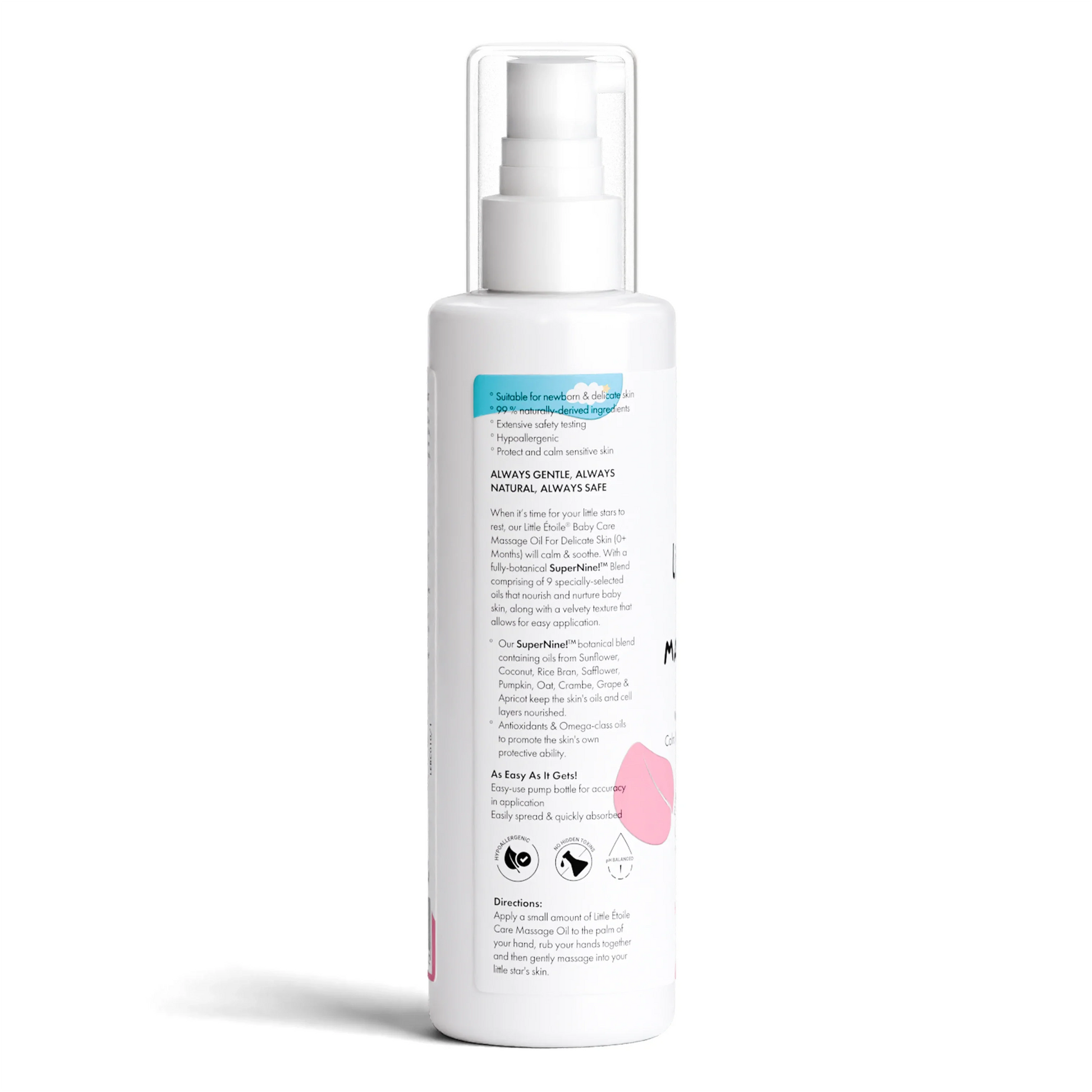 Babies respond to touch and smell as soon as they are born, even before they can see and hear properly. Bond with your baby with our fragrant and calming Little Étoile® Baby Care MASSAGE OIL for Delicate Skin (0+ Months) as part of your daily routine. Featuring our fully botanical SuperNine!™ Blend, carefully crafted with a comprehensive selection of 9 specially selected oils that can help to calm the baby and encourage a sound sleep, while gently moisturizing dryness and restoring their natural glow. Gaze into your baby's eyes and feel the love with this refreshingly fruity massage oil.