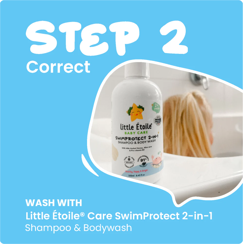 A gentle, protective cleansing shampoo for use after each swimming activity, to combat the effects of chlorine & seawater impurities on hair damage, discoloration and skin dryness.
