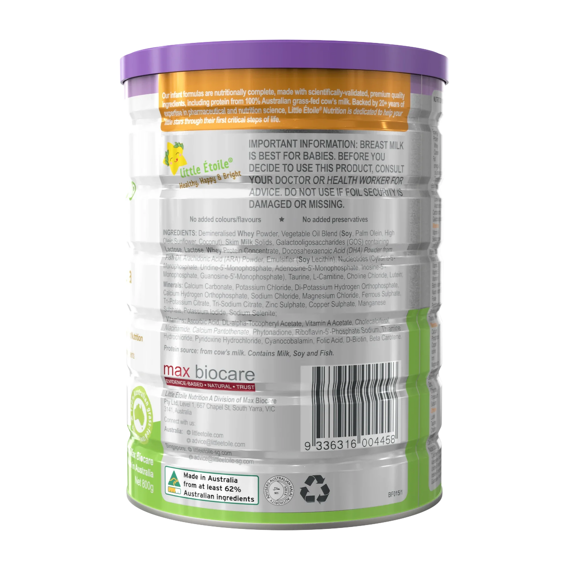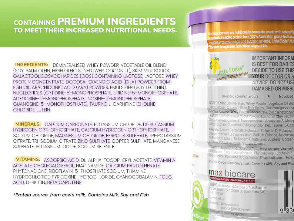 Our Little Étoile® Nutrition Stage 1 Premium Infant Formula is made from grass-fed Australian cow’s milk, with scientifically validated, quality ingredients formulated to meet the nutritional needs of infants from birth to 6 months of age. Backed by 20+ years of expertise in pharmaceutical and nutrition science, Little Étoile® Nutrition is dedicated to help your little stars through their first critical steps of life.