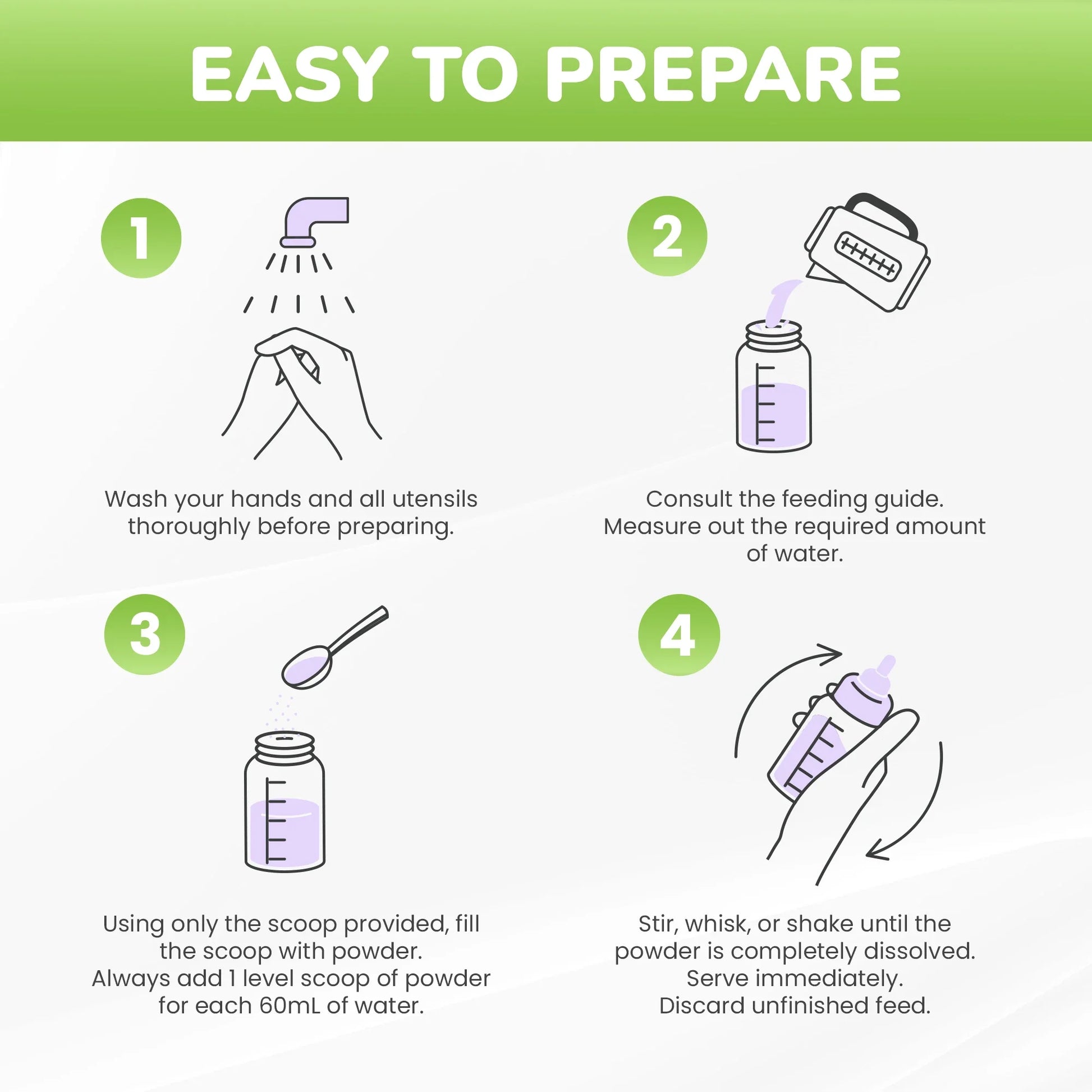 - Always prepare each bottle separately and freshly. Discard unfinished feed.