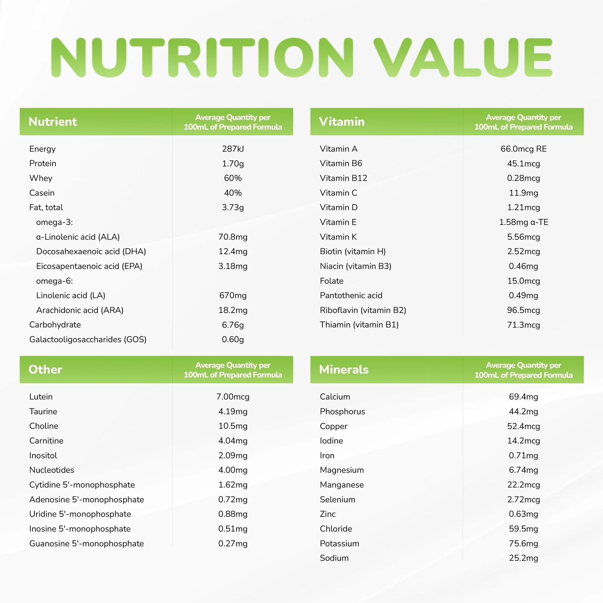 All our formula products use premium Australian milk from grass-fed cows, which has been shown in research to have higher nutritional content than milk from conventionally fed cows and organic milk. *Alothman M et al. Foods. 2019;8(8):350.