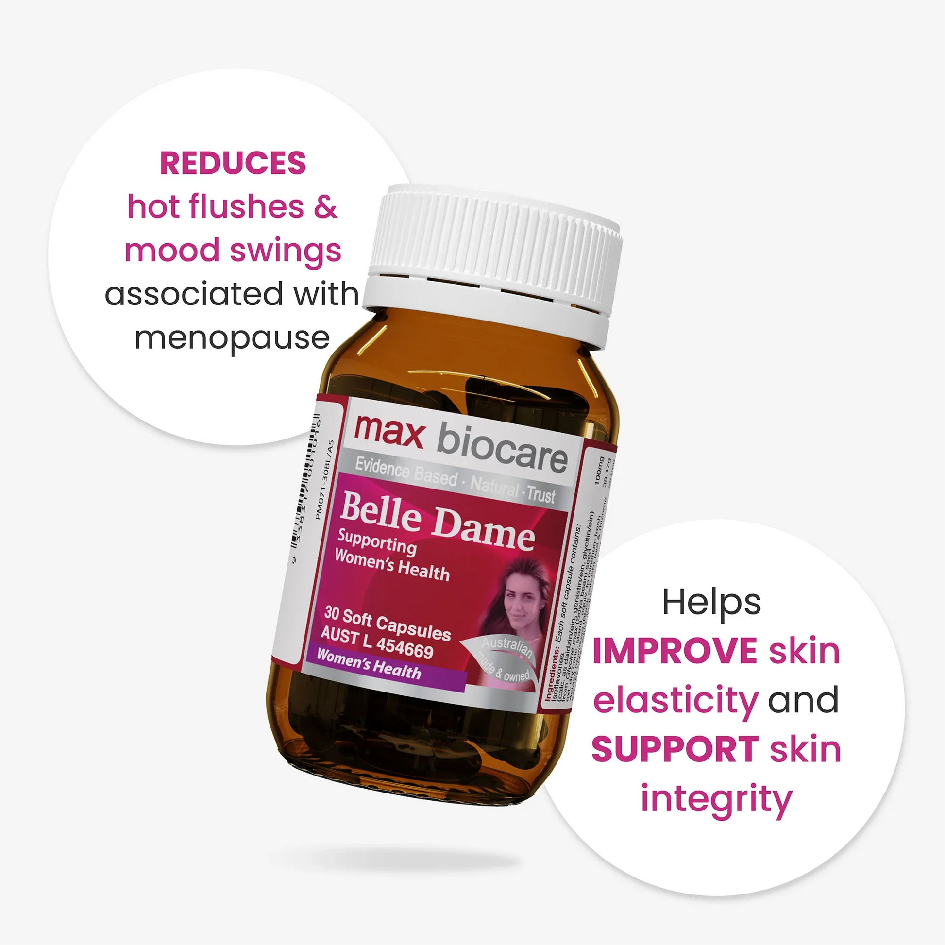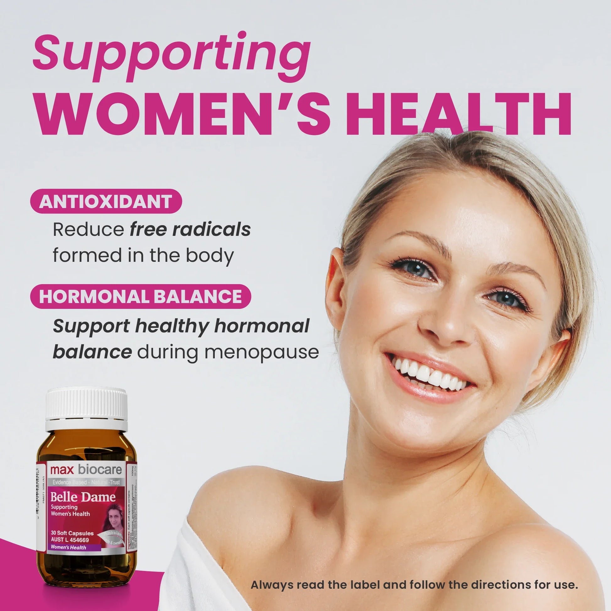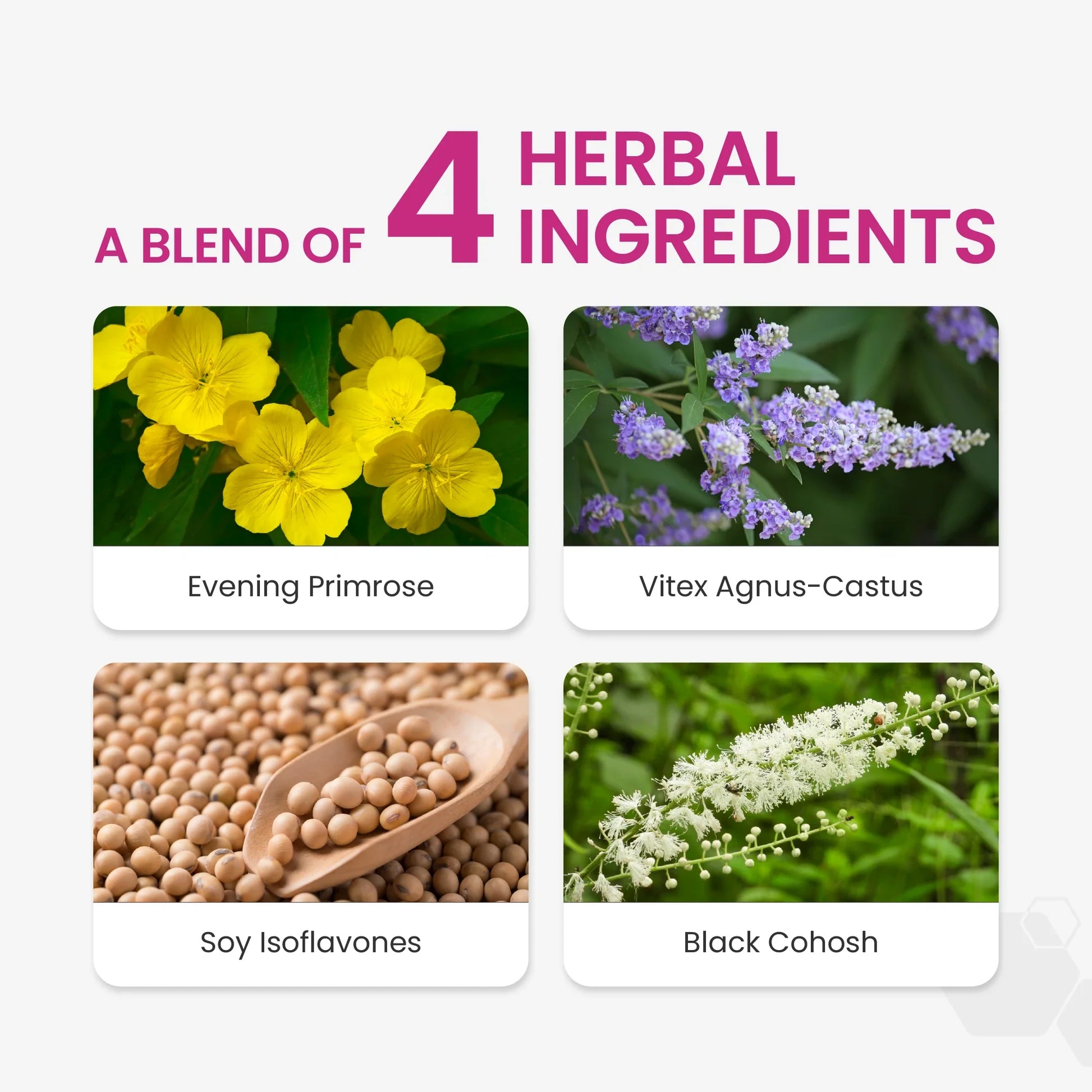 A women’s health formula comprising of soy isoflavones, black cohosh root & rhizome extract, chasteberry fruit extract and evening primrose oil, for skin health and healthy hormonal balance.