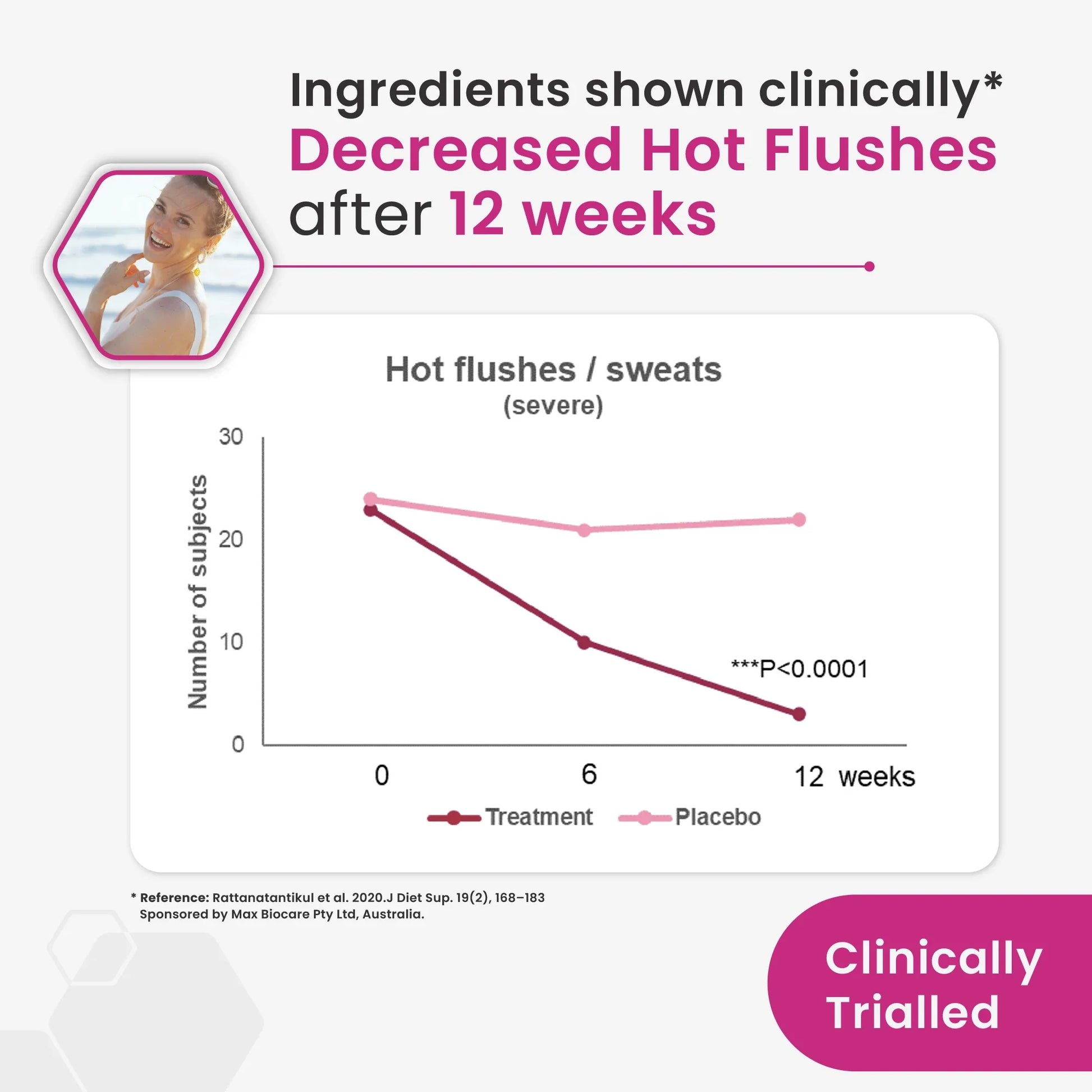 - Decreases hot flushes, moodiness, mood swings and irritability associated with menopause