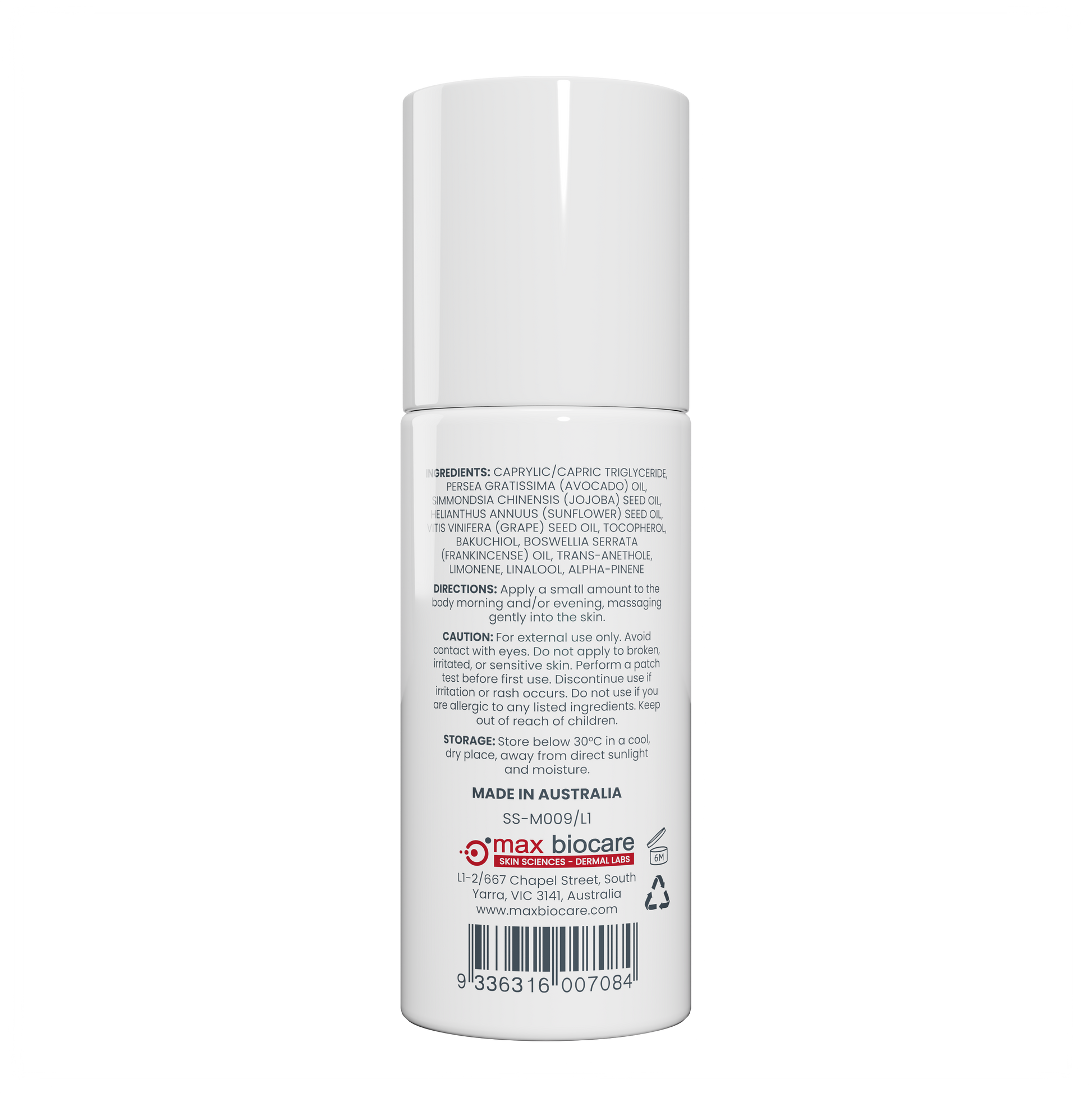 A concentrated blend of nutrient-rich oils with Bakuchiol and Vitamin E. Enriched with Avocado, Jojoba, and Grape Seed Oils, this body oil nourishes, smooths, and supports skin’s natural elasticity. With a delicate touch of Frankincense, it adds a soothing, comforting finish to the skin experience.