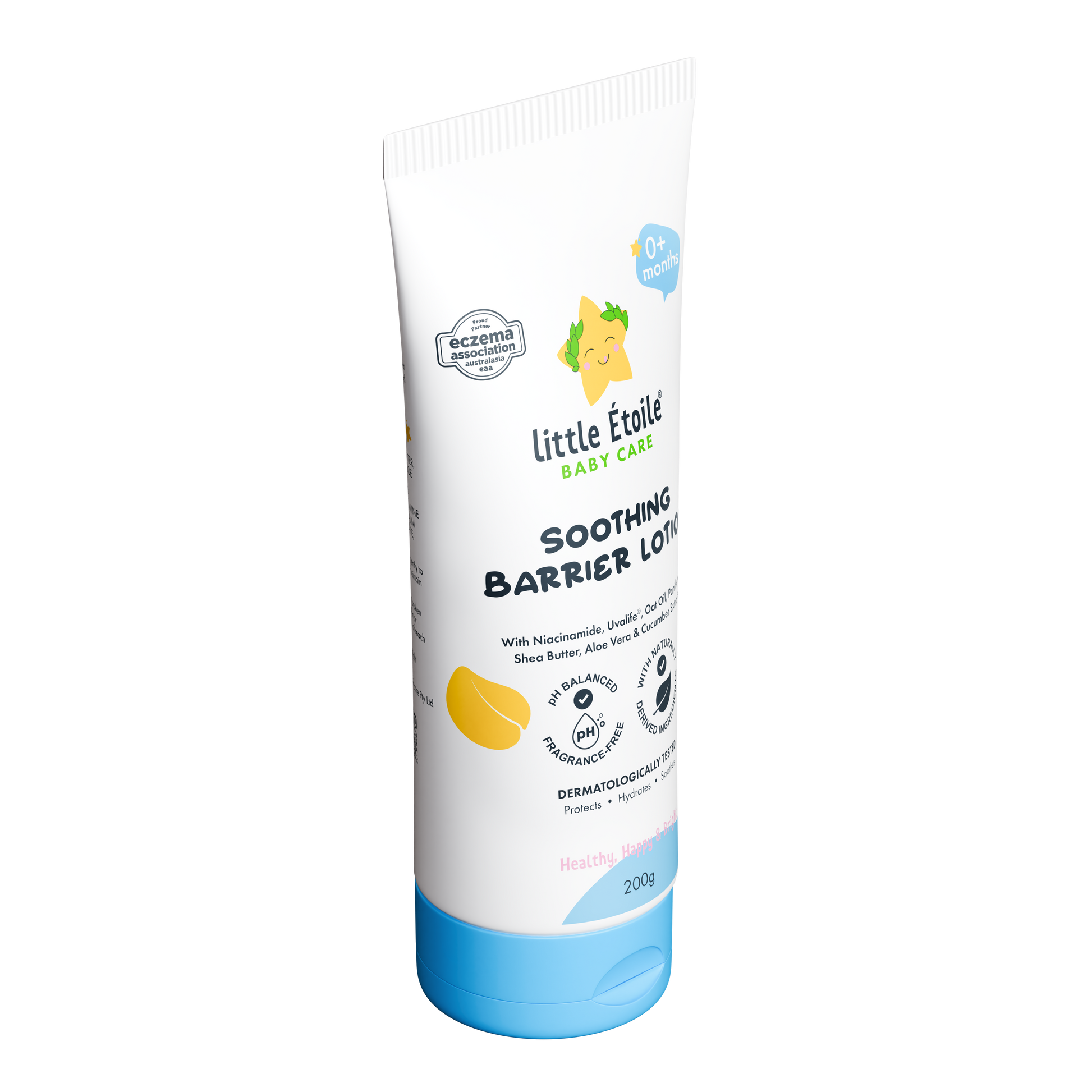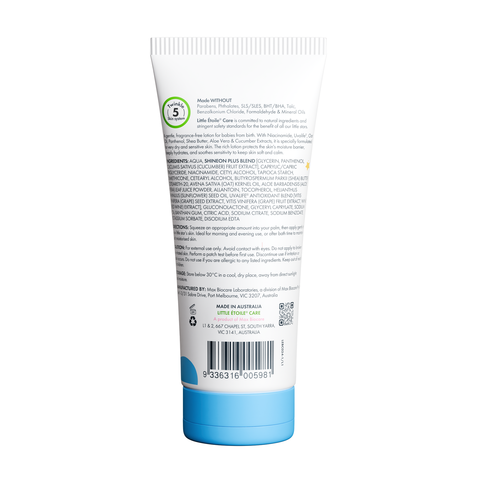 A gentle, fragrance-free lotion formulated for babies from birth. With Niacinamide, Uvalife®, Oat Oil, Panthenol, Shea Butter, Aloe Vera & Cucumber Extracts, it is specially formulated for very dry, sensitive, and eczema-prone skin. This rich lotion protects the skin's moisture barrier, provides long-lasting hydration, calms sensitivity, and nourishes with essential lipids and vitamins — leaving baby’s skin soft, smooth, and calm.